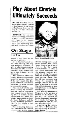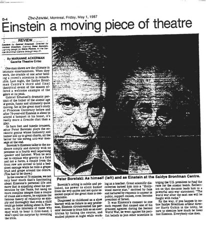EINSTEIN premiered at Toronto Workshop Productions in 1985, starring the late Canadian actor Peter Boretski and directed by Jack Blum. After touring Canada from coast to coast, the play appeared at Israel’s national Habima Theatre (starring Misha Asharov, director Howard Rypp), in several of the United States starring Chris Brittain, in Mexico where actor Patricio Castillo won an award for Best Actor (director Bruno Schwebel), Chile (starring Nisim Sharim Paz), Brazil (Directed by Sylvio Zilber, starring Carlos Palma winning an award for Best Actor), Portugal (Fernando Jorge Lopes) and has enjoyed other productions in Argentina, Spain, Germany, Singapore, India, Pakistan, Dubai and more. In 2008, Einstein was remounted by the Nephesh Theatre Company in Israel (starring Victor Attar, directed by Howard Rypp). The play toured at the La Mama Theatre in New York City, (“Einstein triumphed at La Mama, filled with wonderful irony”), Winnipeg’s Jewish Theatre and made several other stops in North America. Also, in 2008, Carlos Palma and the ACP theatre company of Brazil celebrated 10 years of performing Einstein! In 2014, India’s famed Naseeruddin Shah starred in the Motley Theatre Group’s production of “Einstein” at the Prithvi Theatre of New Delhi. The play was chosen by critics as the first of the 5 best new plays to appear in 2014 and has been remounted several times most recently in 2025. The 20th anniversary of “Einstein” starring Fernando Jorge Lopes was also celebrated at Teatro Extremo of Lisbon in 2025!